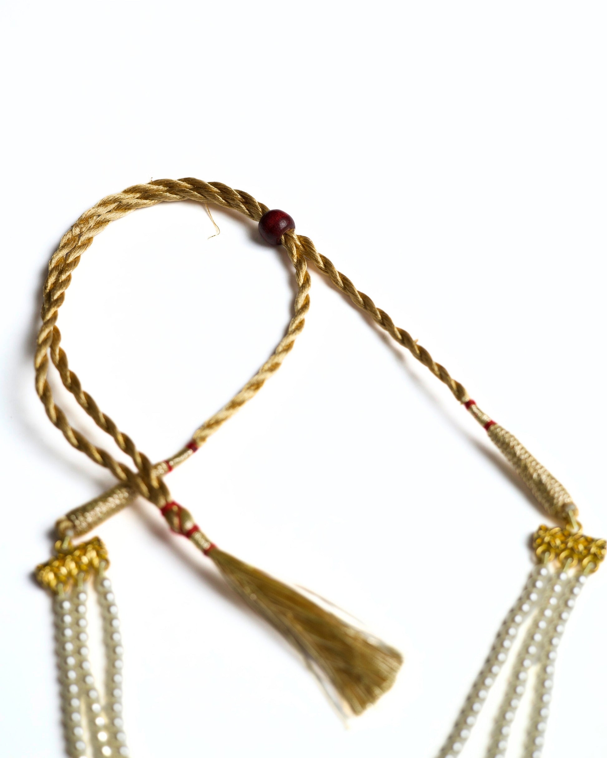 A triple-layer pearl silhouette centred around circular rosette motifs set with deep red stones.
