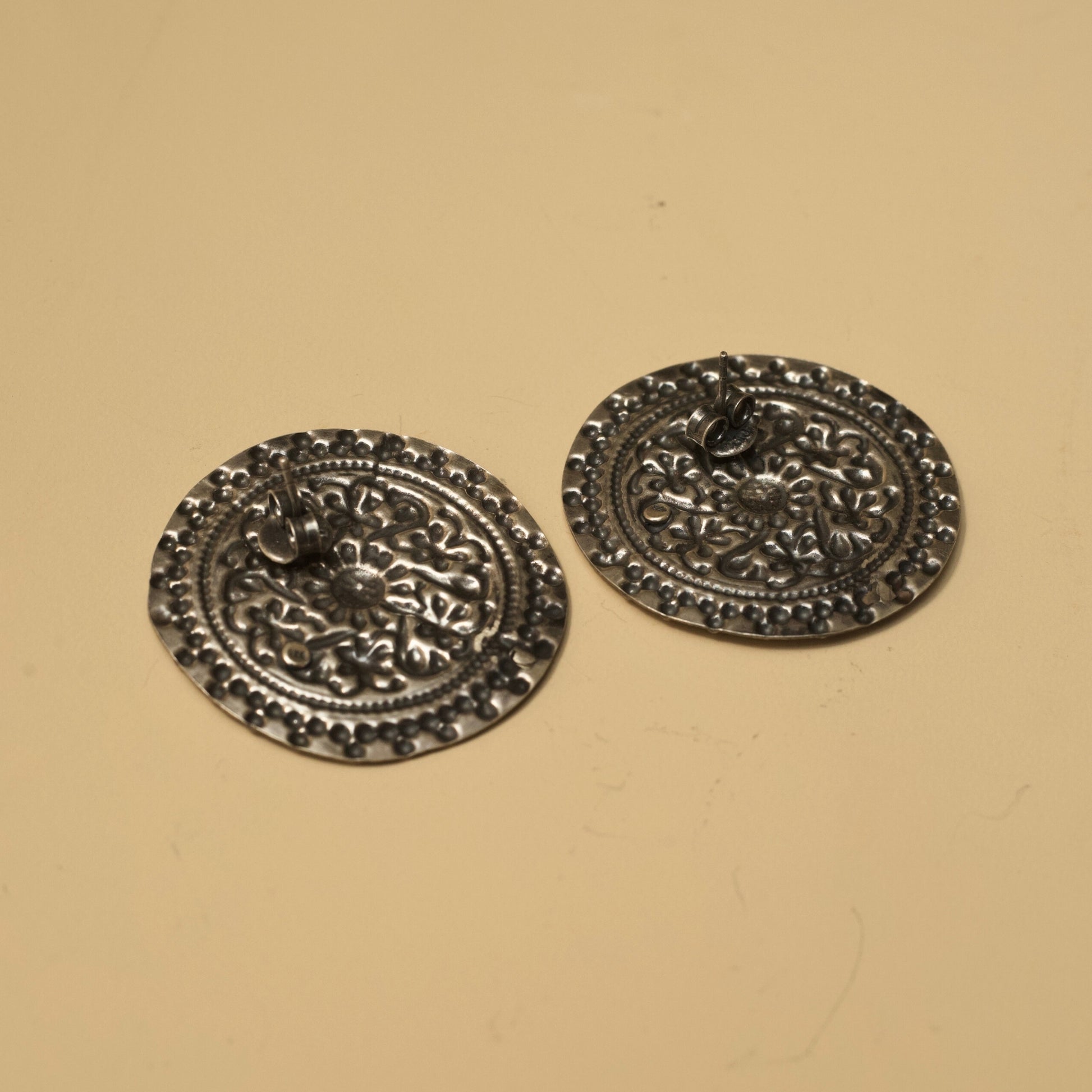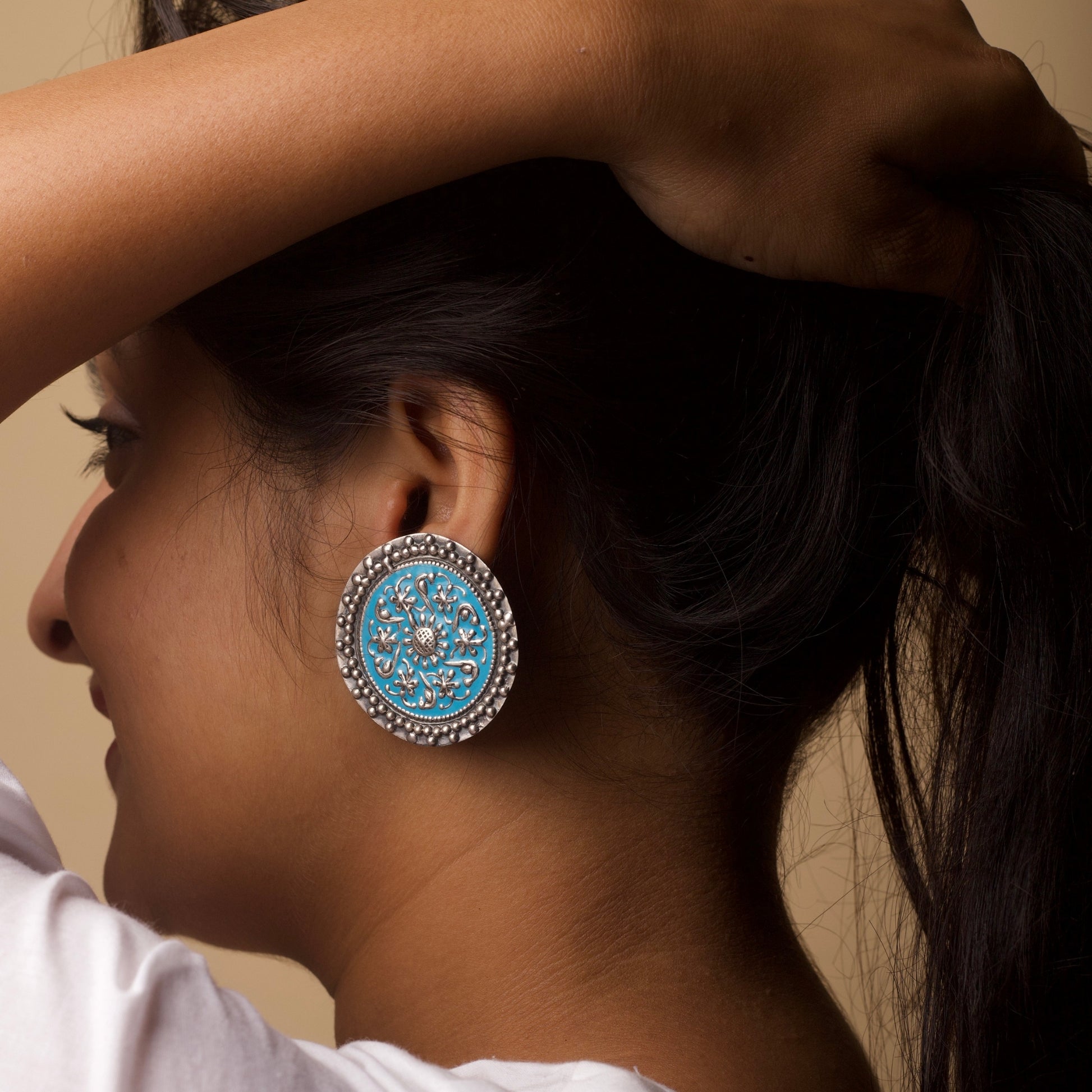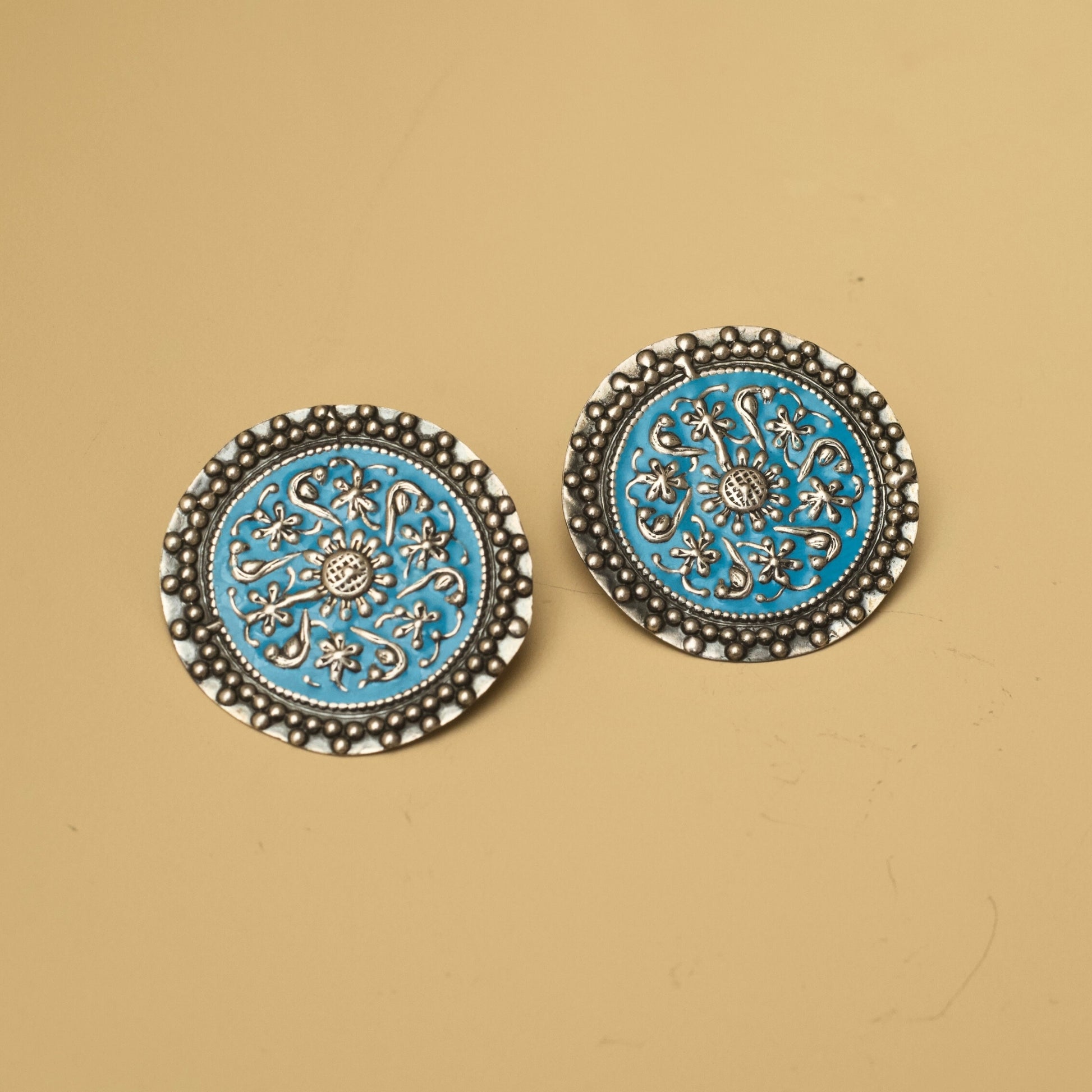 These round silver studs crafted in the traditional Meena art remind you how the universe is conspiring to bring you what's yours, with the motifs in a circular pattern resembling cosmic energy coming together.
