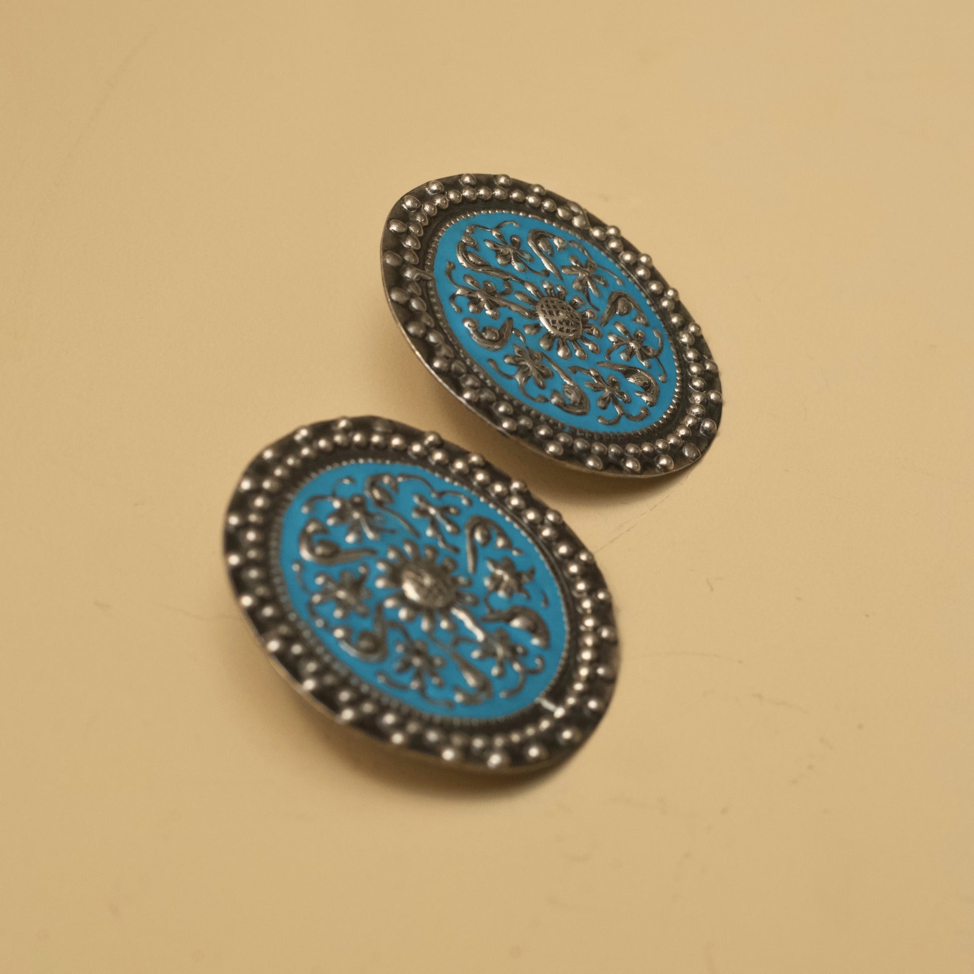 Pair blue enamel studs with simple, minimalist denim pieces like a classic white shirt or straight-leg jeans for a clean, understated look.
